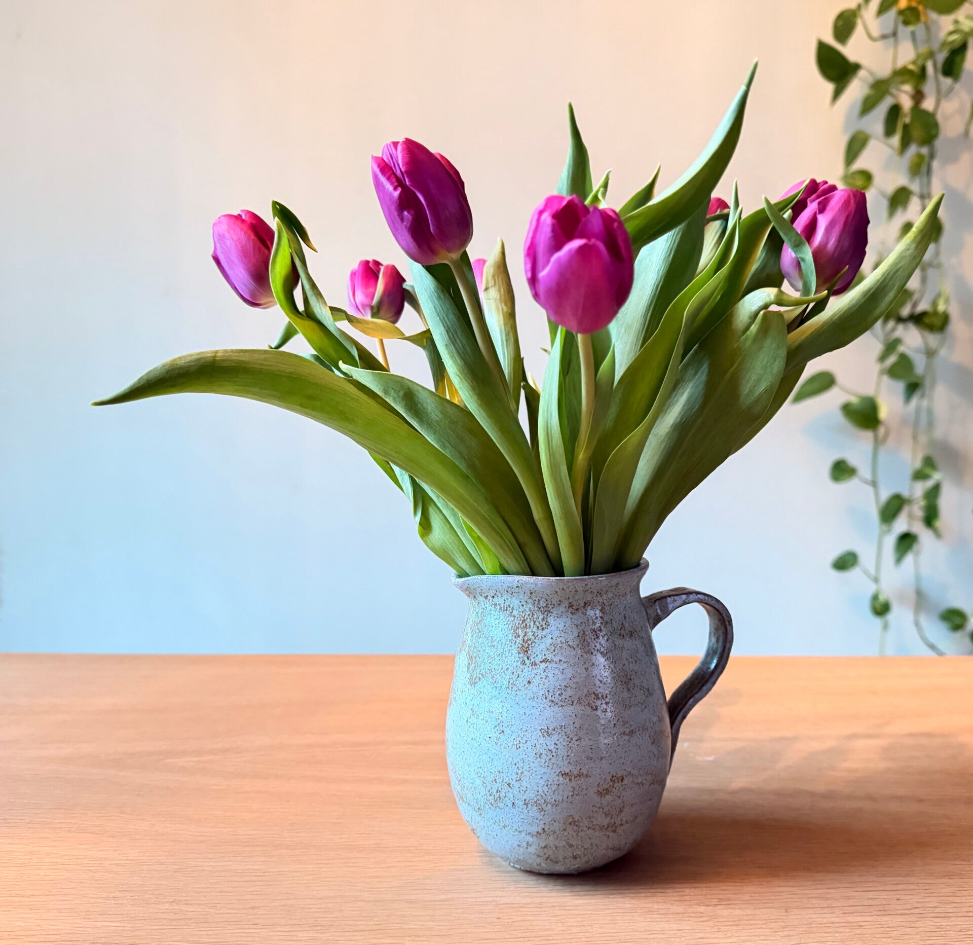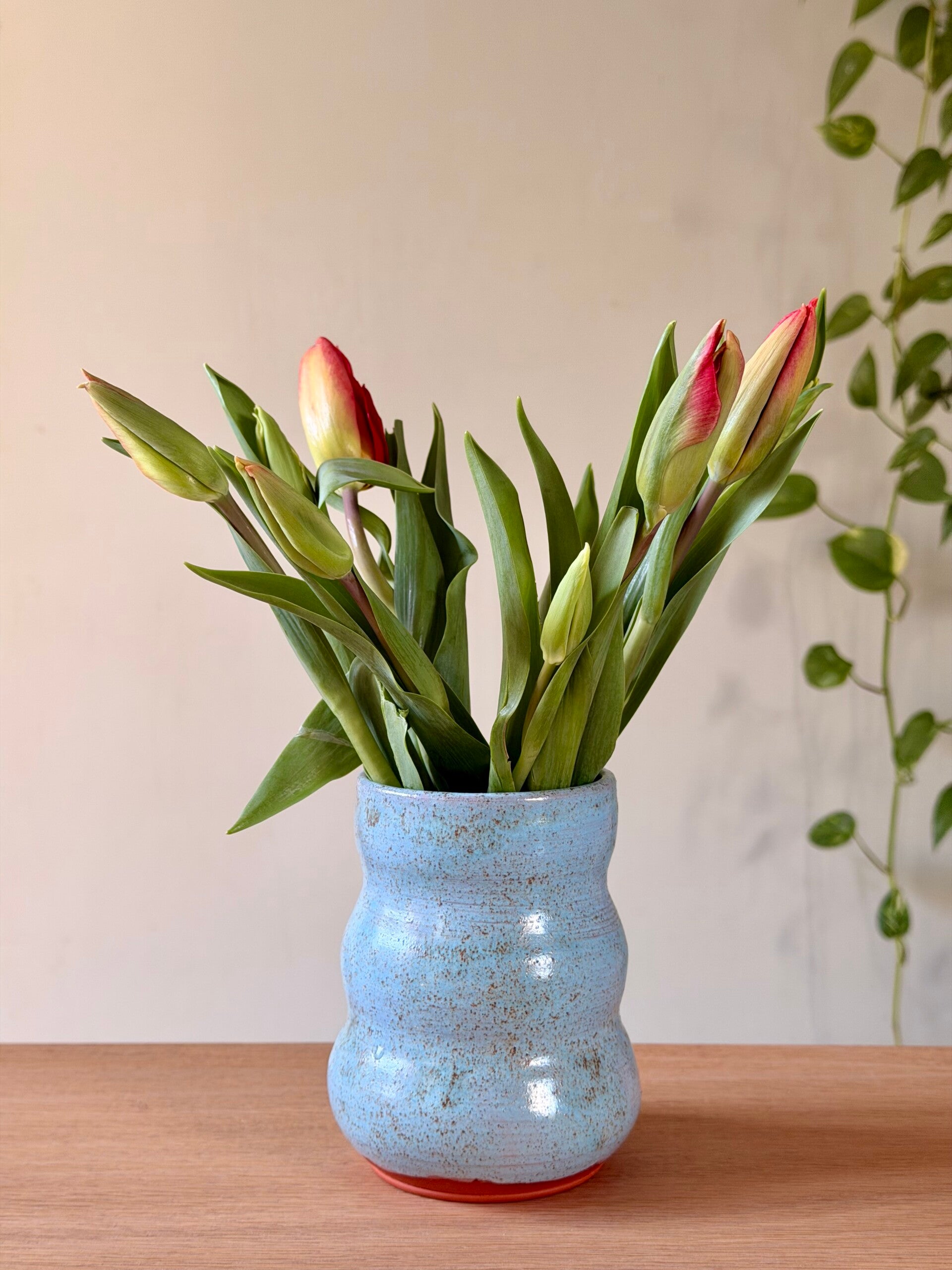 Klein, stevig vaasje geïnspireerd door de golven van de zee. Intuïtief gedraaid in rode klei en geglazuurd met blauw zandkleurig glazuur. Hoogte 11 cm. Diameter 7 cm.