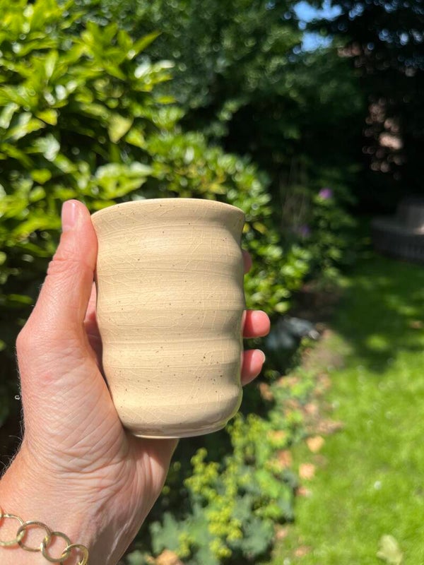 Mokje met golfjes, gedraaid in witte klei met spikkel. Geglazuurd met transparante glazuur voor natuurlijk effect van golvend strandzand.